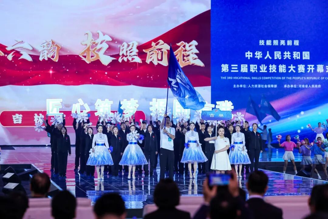 本届大赛由人力资源和社会保障部主办、河南省人民政府承办,以“技能照亮前程”为主题,设置106个竞赛项目,涵盖66个世赛选拔项目与40个国赛精选项目,吸引全国35个代表团、3420名选手同台竞技,是我国规格最高、规模最大的综合性职业技能赛事。开幕式现场灯光璀璨,伴随“大美吉林铸匠魂”的主持人介绍,吕春雨、王迪两位教师与其他参赛成员一道精神抖擞入场,成为吉林省代表团中亮眼的“职教力量”。