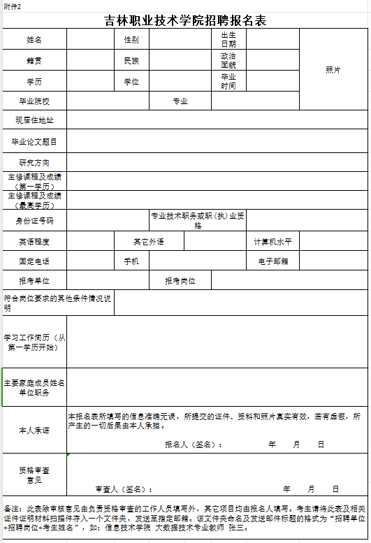 1.本次招聘公告有效日期截止岗位招满为止,应聘人员须填写《吉林职业技术学院招聘报名表》并提交电子版本硕毕业证、本硕学位证、资格证等岗位需求的材料。请将报名表及相关证件证明材料扫描件存入一个文件夹,每样材料做好命名,将文件夹打包压缩发送至指定邮箱。投递简历到邮箱(请以“应聘岗位名称+本人姓名+最高学历学位”命名);