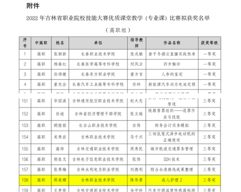 为认真贯彻落实吉林省《关于推动现代职业教育高质量发展的意见》、《职业教育提质培优行动计划(2020-2023年)》等文件精神,鼓励青年教师积极参加专业比赛,提高教师专业化水平和创新能力。吉林职业技术学院医药学院护理专业教师邵美娜老师踊跃报名,积极备战省赛。在备赛过程中,医药学院陈华勇教授作为指导教师对其认真指导,不论从教学设计到课堂语言、PPT等,都严格要求,不断规范,精益求精。经过综合评审,医药学院教师邵美娜自主设计说课课题《成人护理2》荣获大赛三等奖。