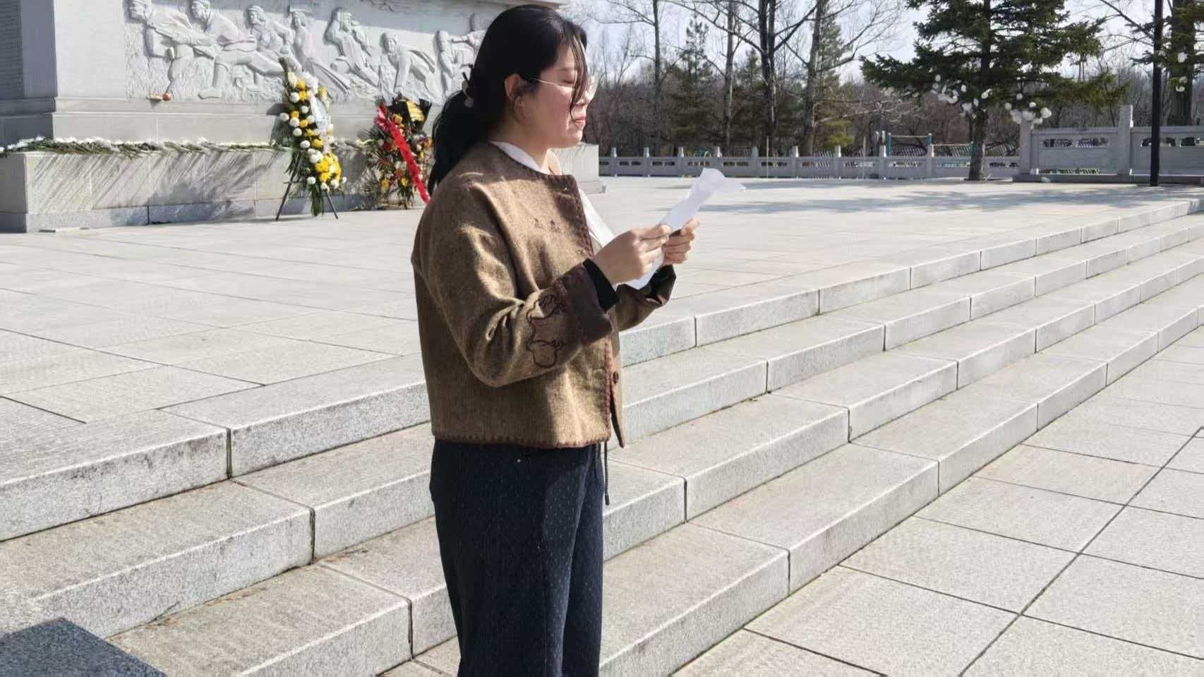 默哀毕,马克思主义学院教师代表刘雪深情讲述革命烽火岁月。她以鲜活事例再现先烈浴血奋战、视死如归的英勇事迹,勉励师生铭记历史,从英烈精神中汲取力量,将爱国情、强国志转化为报国行的生动实践。