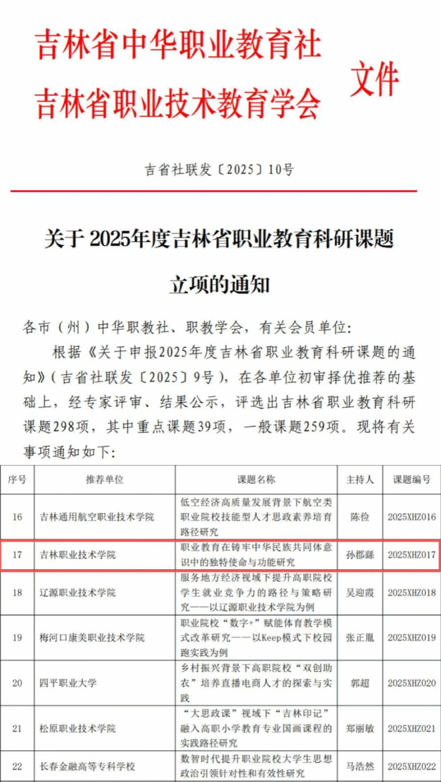 (通讯员 马雪菲)近日,吉林省职业教育科研管理平台正式公布 2025 年度吉林省职业教育科研课题立项名单,我校青年教师孙郡繇主持的《职业教育在铸牢中华民族共同体意识中的独特使命与功能研究》凭借鲜明的创新价值、扎实的研究基础和严密的论证逻辑,成功获批重点课题立项,这是我校在职业教育科研领域的又一重要突破。