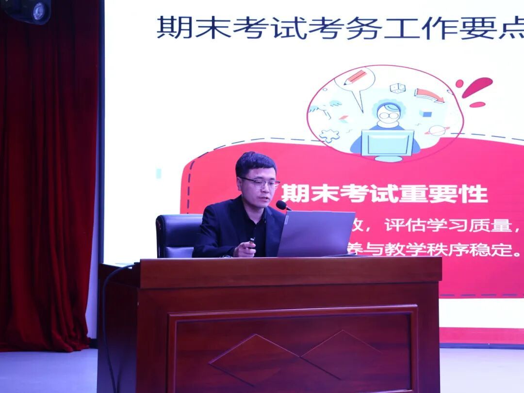教务处李威远对本次期末考试的考务工作进行了全面细致部署。他结合学校相关规章制度与以往工作经验,重点围绕以下几个方面展开说明:一是详细解读了本次考试的总体安排、时间节点与考场分布,明确了监考教师的职责与具体工作流程;二是着重强调了试卷的保密、领取、发放、回收及保管等环节的操作规范与纪律要求,杜绝任何失泄密风险;三是深入讲解了考场规则的执行、考生身份的核验、违纪舞弊行为的认定与处理程序,要求监考教师既要严格管理,又要体现人文关怀;四是对考试过程中的突发情况和应急处置预案进行了说明,确保能及时、妥善处理各类偶发事件;五是成绩录入