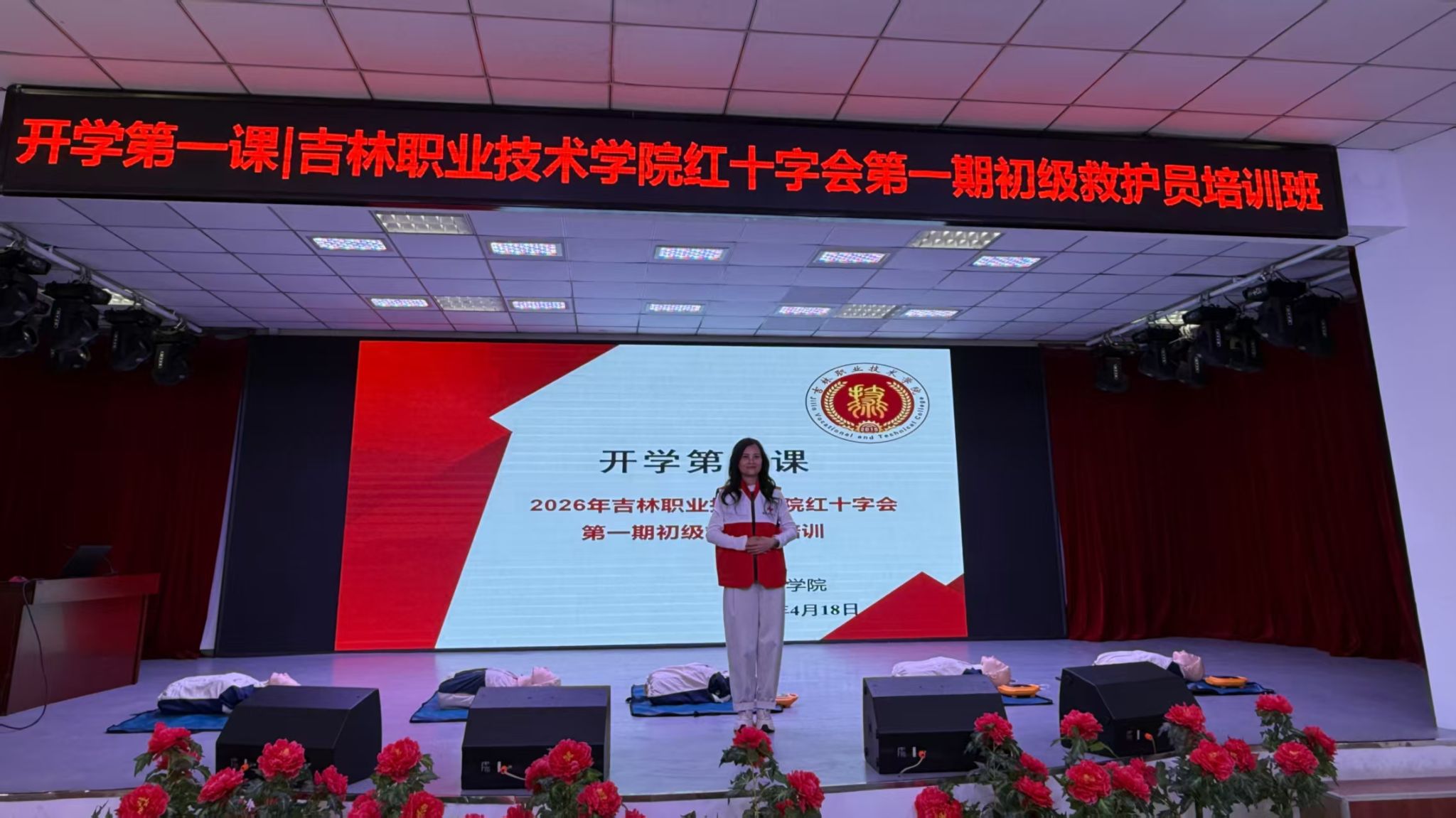 (通讯员 张巍)为深入落实学校 2026 年春季学期“开学第一课”系列教育活动要求,推动安全教育与专业教育深度融合,切实提升医药学子应急救护能力,4 月 11 日,医药学院在吉林职业技术学院行政楼三楼报告厅成功举办2026年吉林职业技术学院红十字会第一期初级救护员培训。本次培训作为学院“开学第一课”特色选修核心课程,面向2025级中医学专业50名学生开展系统教学,特邀延边州红十字会骨干救护师资张春艳、曲莉明和米红卉主讲。经过8学时理论与实操一体化教学及严格考核,全体参训学生100% 通过考核,顺利取得红十字初级救护员证书,标志着学院红十字应急救护常态化培训正式启动。