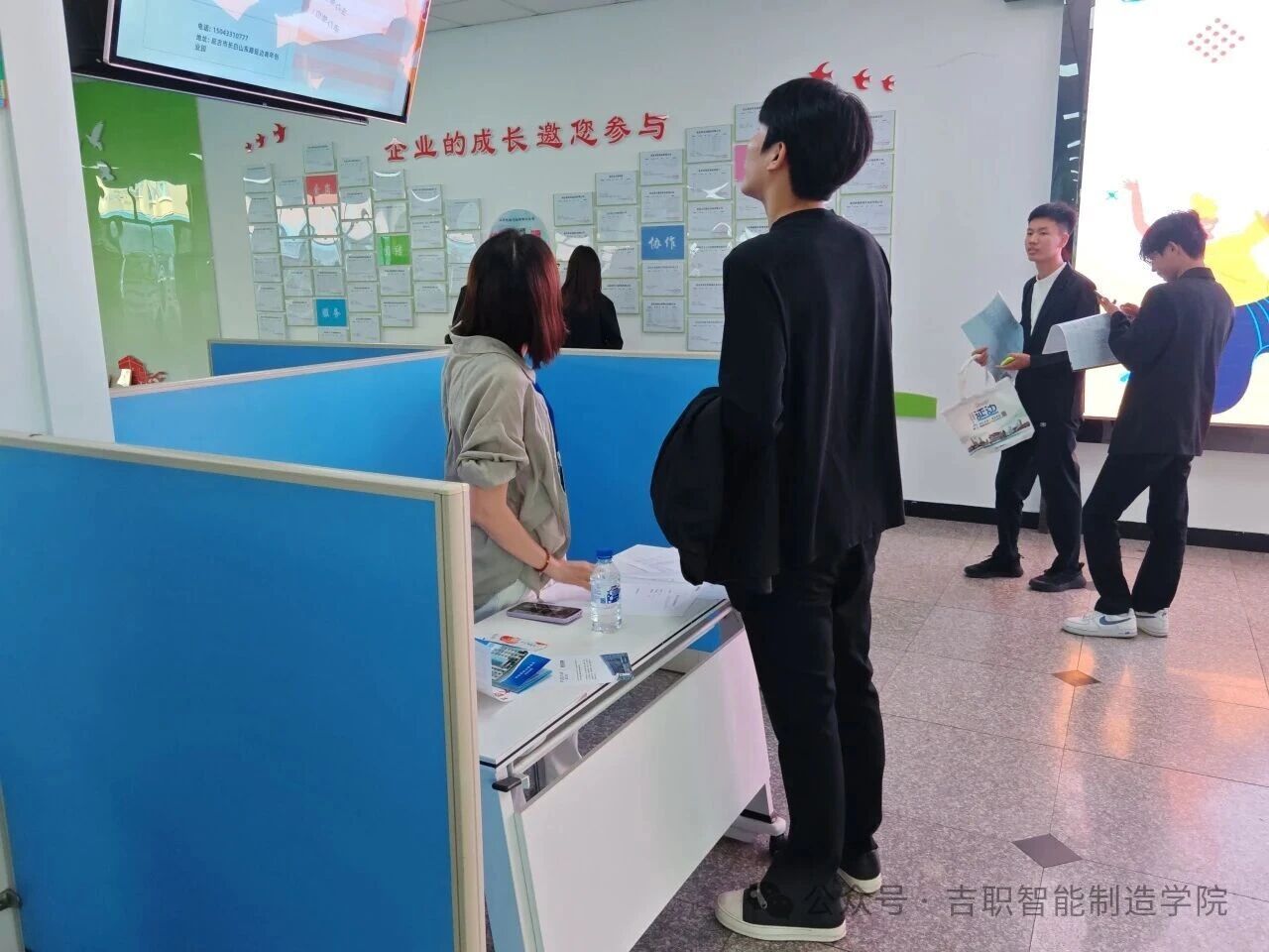 招聘会现场,延边州内多家聚焦智能制造、机械制造、电气自动化等领域的企业设立展位,通过宣传展板、资料手册发放及现场宣讲等形式,向学生详细介绍企业发展概况、岗位核心技能要求、职业晋升路径及人才培养体系。张钟老师全程陪同学生走访各展位,结合学院专业课程设置与学生的学习方向、兴趣特长,分析不同岗位对人才能力的需求重点,指导学生如何精准表达自身的专业知识储备与实践经历,鼓励大家主动与企业招聘负责人交流,深入了解行业动态。