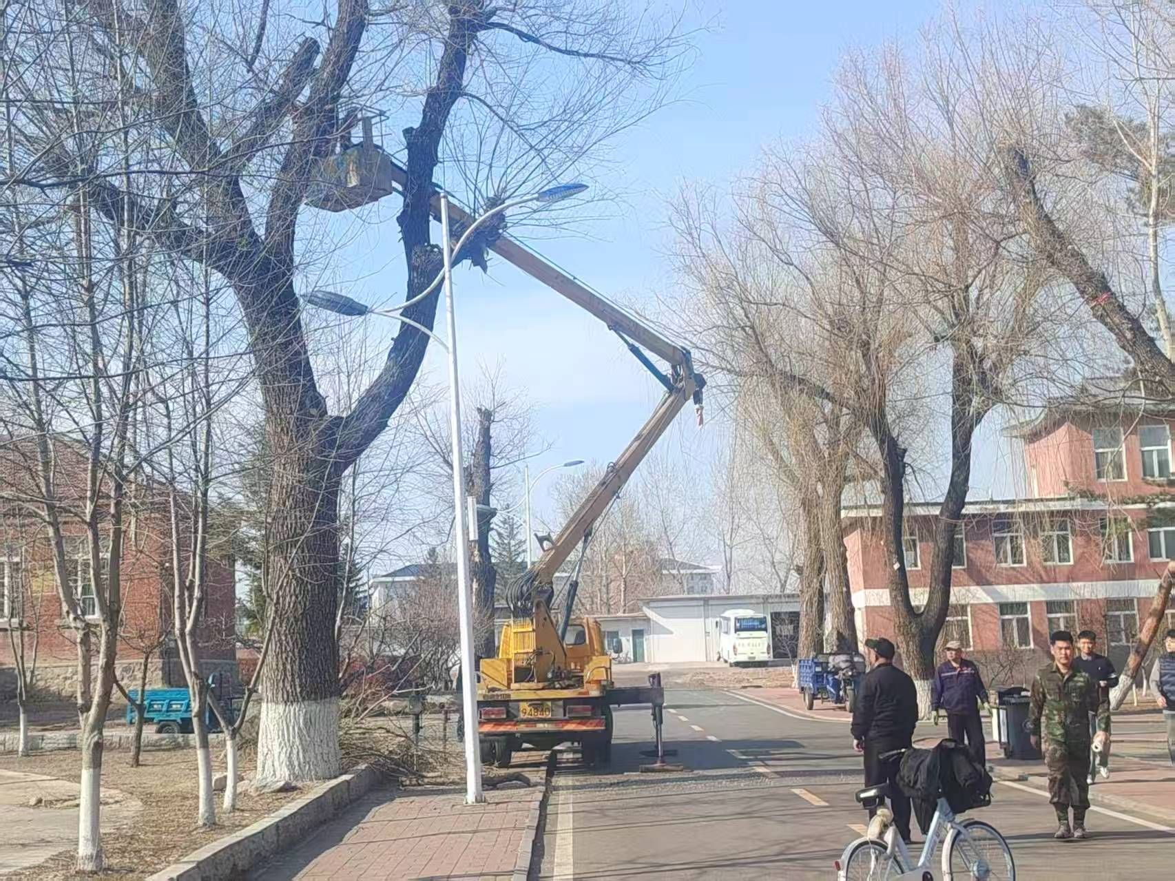 后勤管理处提前谋划、周密部署,结合校园绿化布局和大风天气安全防范要求,科学划分重点清理区域,明确工作范围、人员分工与作业标准。工作人员对校园内行道树、绿化带、操场、道路周边等关键区域进行拉网式排查,重点排查枯死枝、病弱枝、松动易断枝条,逐项清理,确保隐患排查无死角、整治无遗漏。