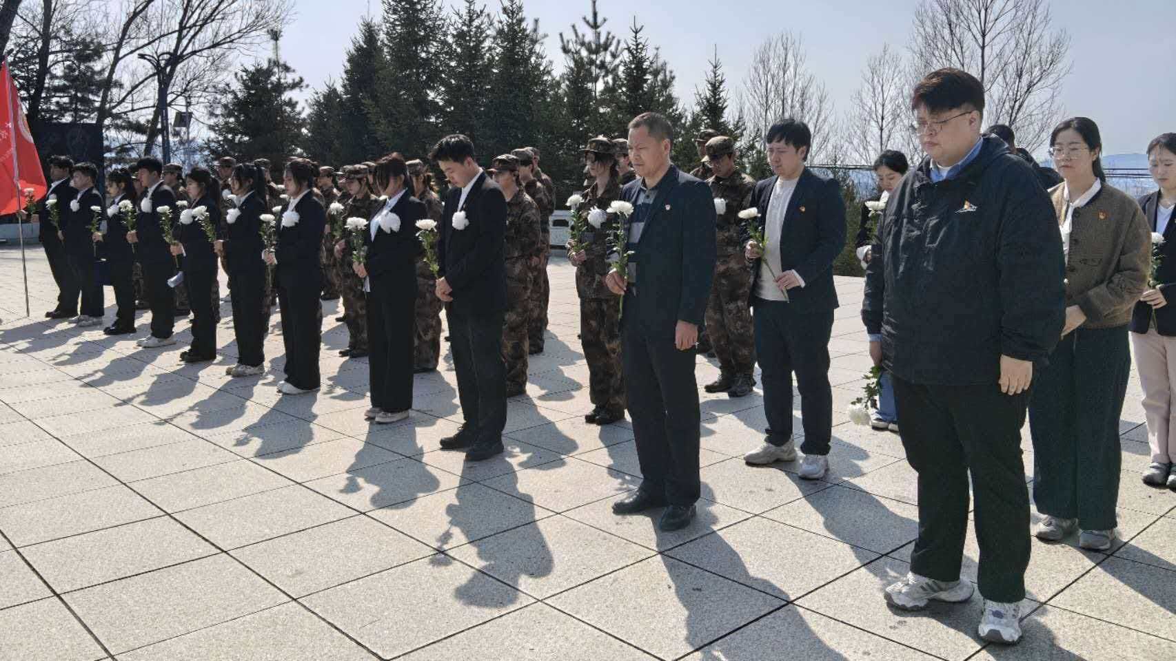 松柏肃立,气氛庄重。全体师生整齐列队,面向英烈纪念碑垂首默哀。三分钟静默,凝聚着对先烈无尽的追思与崇高敬意。革命先辈为民族独立、人民解放献出生命的壮烈情怀,深深镌刻于师生心间,化作砥砺前行的精神动力。