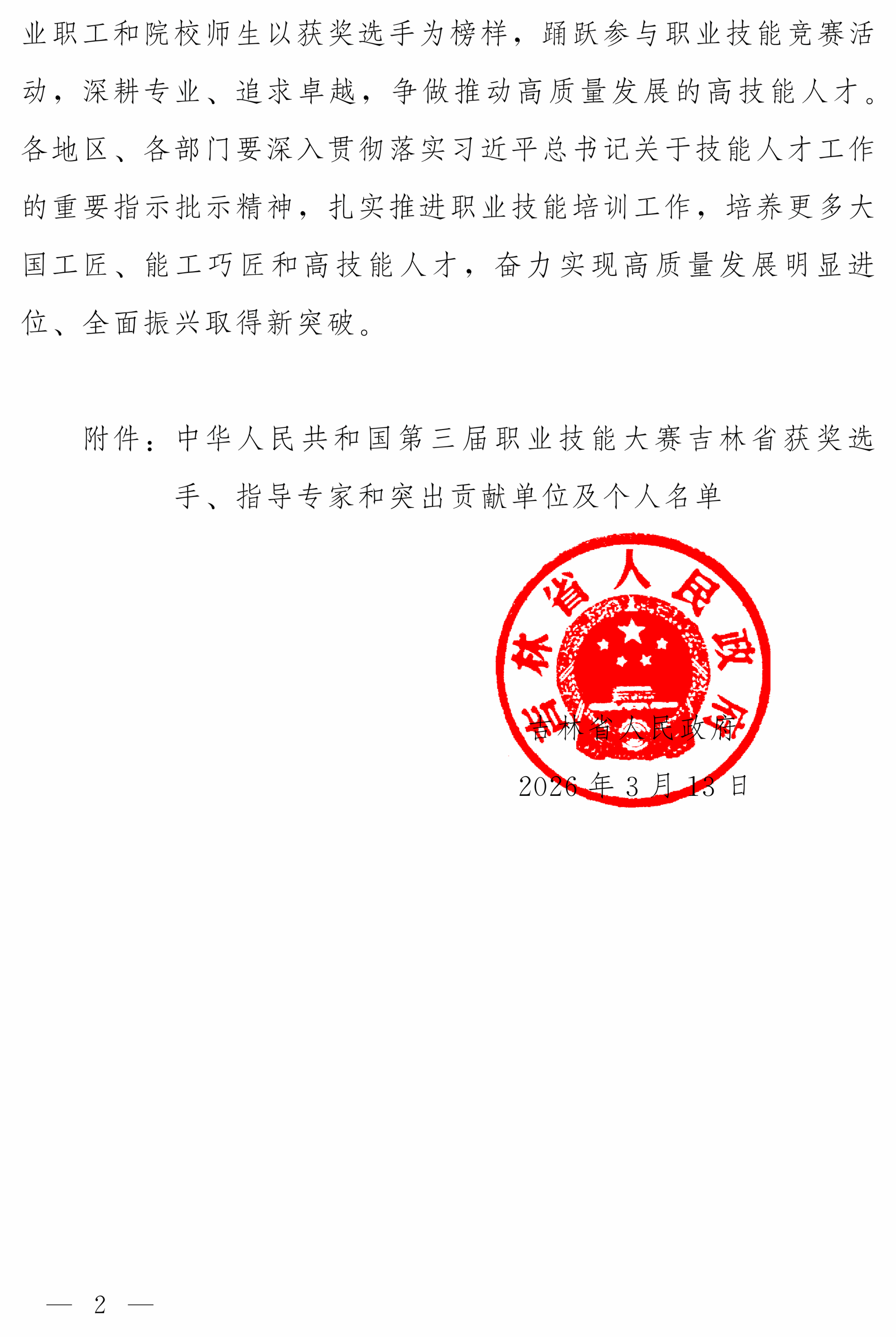 近日,吉林省人民政府印发《关于表扬中华人民共和国第三届职业技能大赛吉林省获奖选手、指导专家和突出贡献单位及个人的通报》(吉政函〔2026〕16号),对在第三届全国职业技能大赛中表现优异的获奖选手、指导专家及作出突出贡献的单位和个人予以通报表扬。吉林职业技术学院多位师生、教职工获此重磅表彰,用实力书写了技能成才、匠心育人的亮眼答卷!