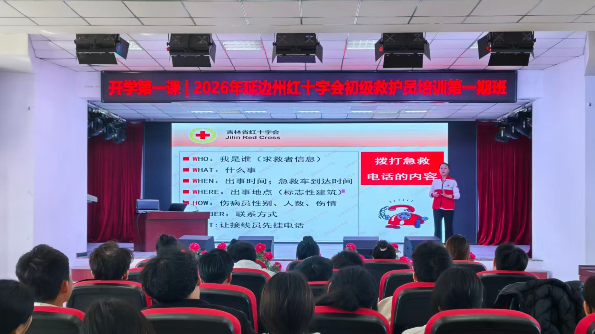 学院高度重视本次培训,前期周密部署、统筹推进。学院办公室协调场地与物资保障,学生工作办公室落实学员组织与纪律教育,红十字志愿服务队负责签到引导与秩序维护,安全工作小组排查隐患、制定预案。延边州红十字会全程提供技术支持,配备心肺复苏模拟人、模拟 AED、绷带、三角巾、急救箱等专业器材,为培训高质量开展提供坚实保障。